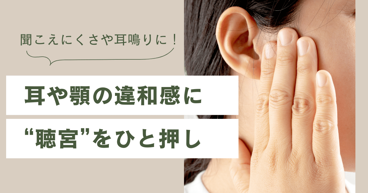 聴宮は、耳のつまり・耳鳴り・音のこもり・あごの緊張などにおすすめのツボです。