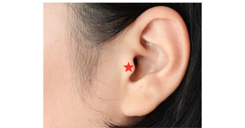 • 耳の穴の前にある小さな出っぱり(トラガス)周辺