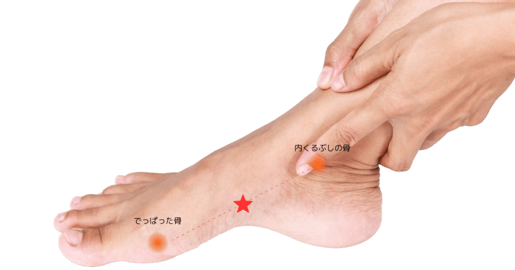- 足の内側、親指の付け根の出っ張りと内くるぶしの骨の間
