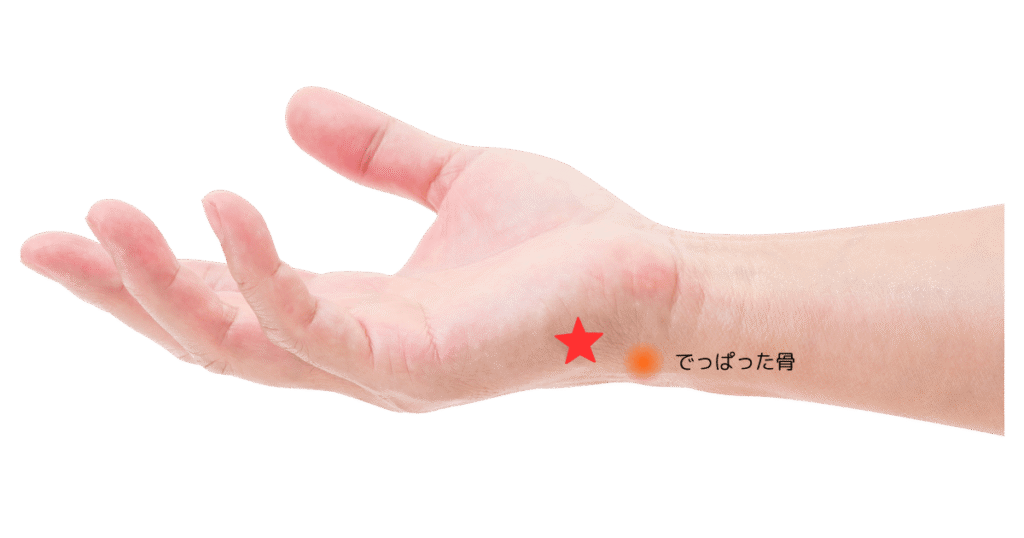- 手首の小指側にある出っぱった骨(尺骨茎状突起)の少し先、手の外側のくぼみ